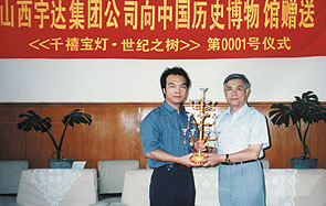 1999年8月3日,中國歷史博物館貴賓接待室。山西宇達(dá)集團(tuán)公司向中國歷史博物館捐贈(zèng)世紀(jì)之交高級(jí)藝術(shù)傳世珍品《千禧寶燈 世紀(jì)之樹》儀式正在這里舉行,中國歷史博物館副館長孔祥星先生從宇達(dá)集團(tuán)總經(jīng)理衛(wèi)恩科手中接過金光燦燦的珍品時(shí),在場(chǎng)的數(shù)