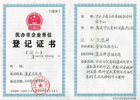 宇達中國古代青銅技術(shù)研究中心登記證書